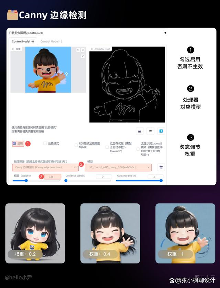 使用预处理器时要与模型一一对应起来,如与处理器选择 canny,则相对应的模型也要选择 canny