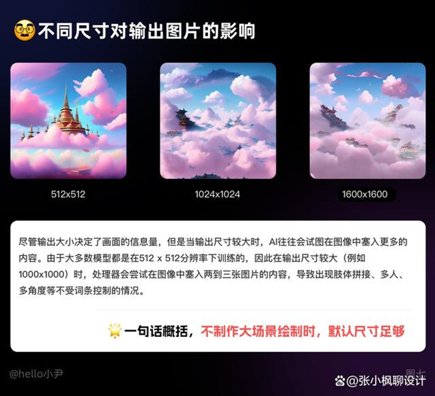 画面的信息量取决于输出图片的大小。在全身构图中,一些细节,例如脸部、饰品和复杂的纹样,只有在较大的图像中才能得到充分的展示空间,如图像太小,脸部,手部,一些细节就会被压缩成一团,无法得到充分的表现,以下图的风景为例,当画幅越大时,展示的内容越多。