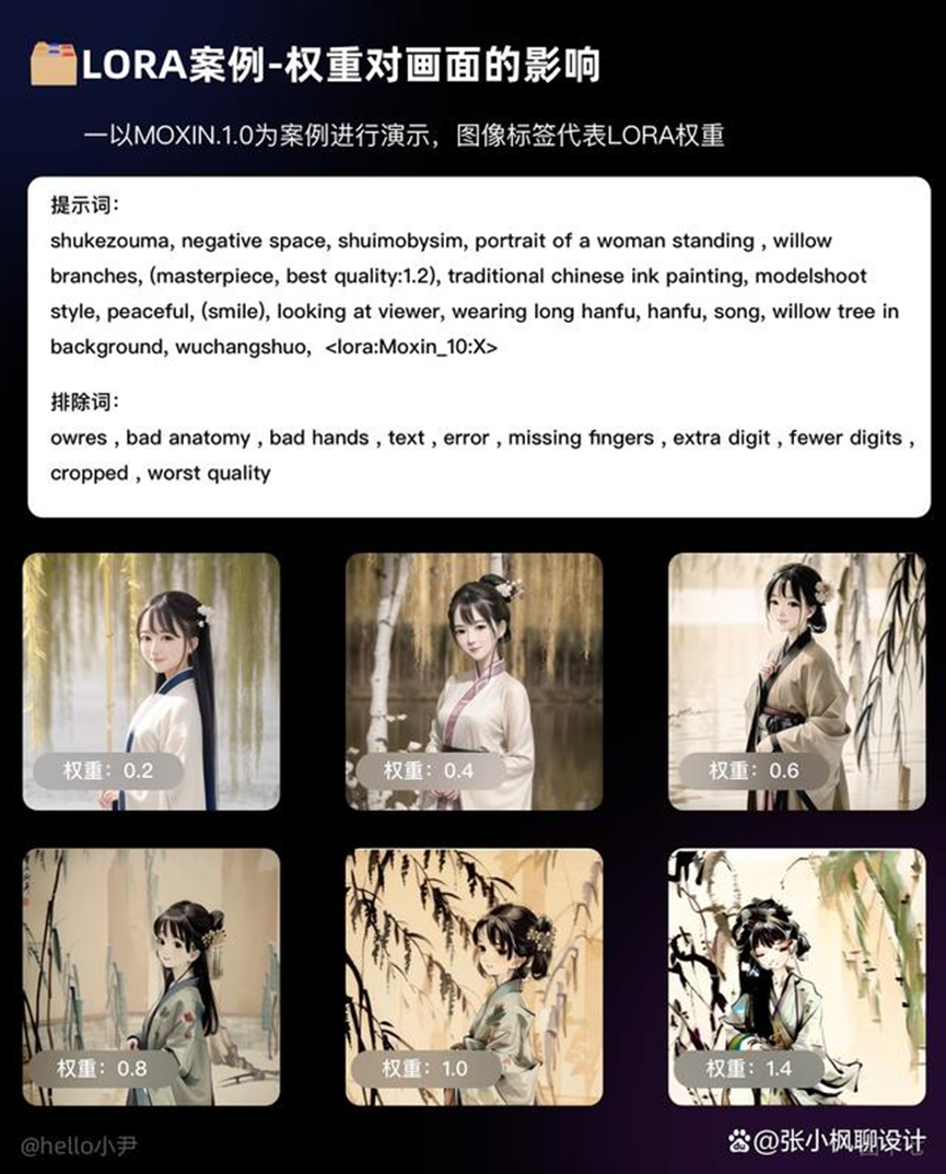 通常来说,每个 LORA 模型都有对应的底膜和触发词汇。我们可以查看 LORA 作者产出的相关图片,从中获取模型信息,并从中选择一些提示词和排除词来指定生成图像的方向。需要注意的是,每个 LORA 模型对输出图像的权重设置是非常重要的。权重设置越大,对画面的影响因素就越浅。通常情况下,权重应该控制在 0.7-1 之间。如果权重过高,会大幅度影响出图的质量。