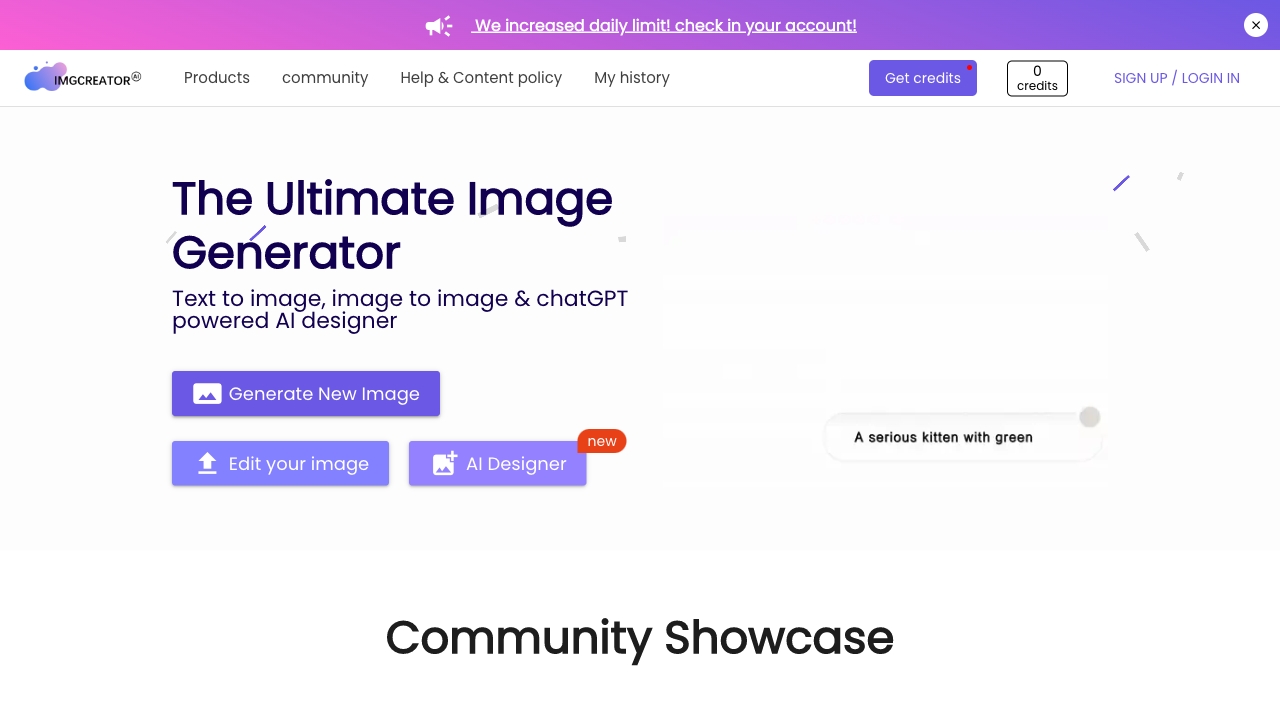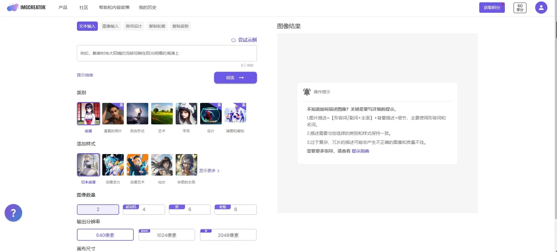 ImgCreator.AI是ZMO.AI旗下一个人工智能AI图像生成器,输入提示文本,AI自动帮你生成图像!支持文生图(文字生成图片),图生图模式,并拥有AI房间设计功能,上传你的空间照片,让AI在几秒钟内重塑您的梦想房间,一键帮你生成室内设计图!还可以根据图像生成轮廓线稿,帮你生成相似轮廓的图片!官网网站https://imgcreator.ai/