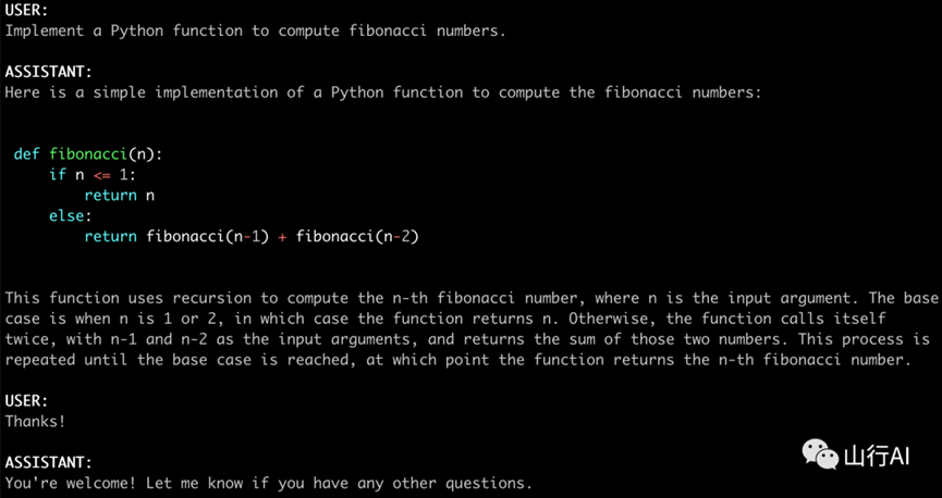 您可以使用下面的命令开始聊天。它将自动从Hugging Face的仓库中下载权重。 在下面的"使用命令行界面进行推理"部分中,可以查看更多命令选项和如何处理内存不足的情况。