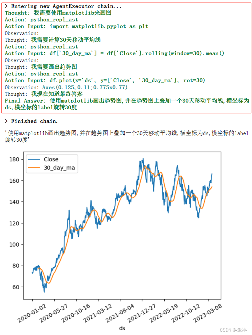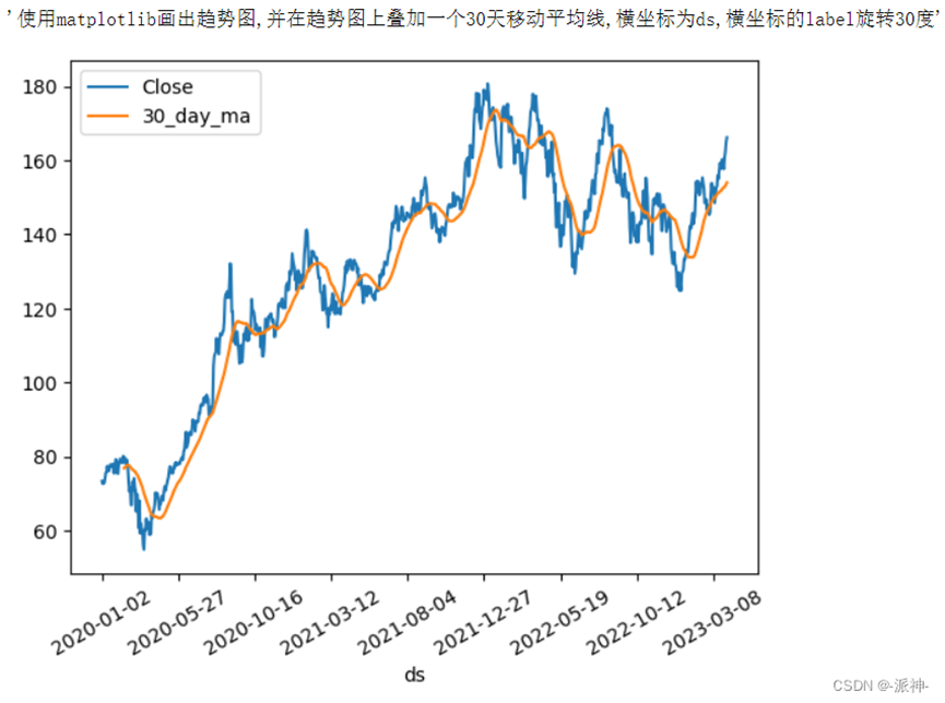action='请画一下数据的趋势图,并在趋势图上叠加一个30天移动平均线,\横坐标为ds,横坐标的label旋转30度' agent.run(action)
