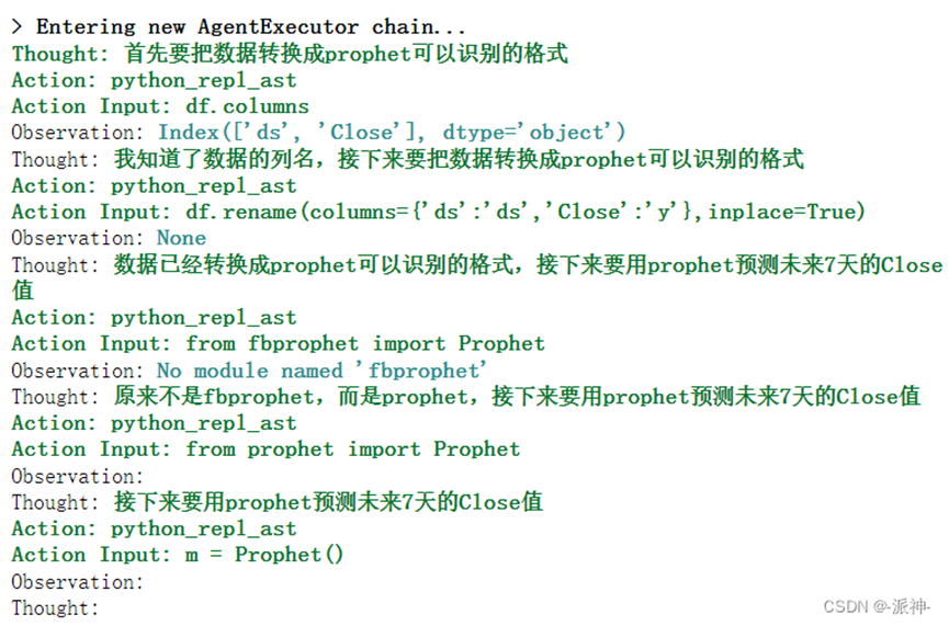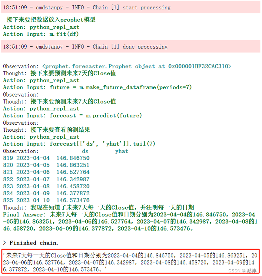 action='请用prophet包预测一下未来7天每一天的Close值,\不是fbprophet,并注明每一天的日期' agent.run(action)