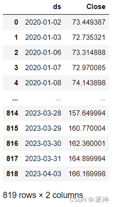 我们从雅虎网站上下载了苹果公司的股票价格数据,数据中的ds为日期,Close为当日的收盘价