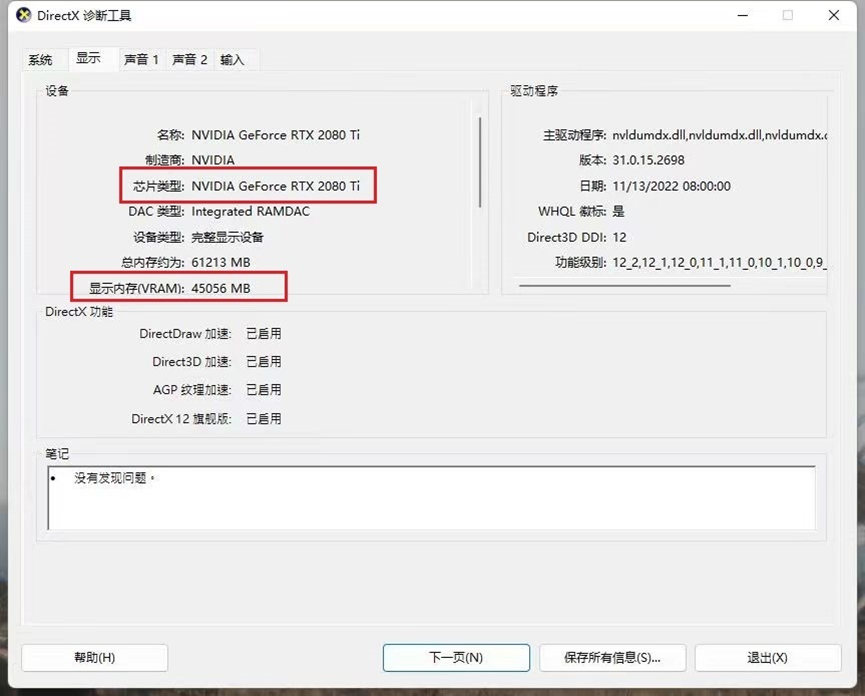 最后,该极客分享了相关软件的验证截图,根据GPU-Z(图四)和Windows系统自带的DirectX(图五)显示,这两款软件都成功识别、检测到这款GeForce RTX 2080 Ti显存拥有搭载了44GB显存,当然,电脑不会黑屏,能正常开机,Windows操作系统必须率先识别,这些是一切的基础。