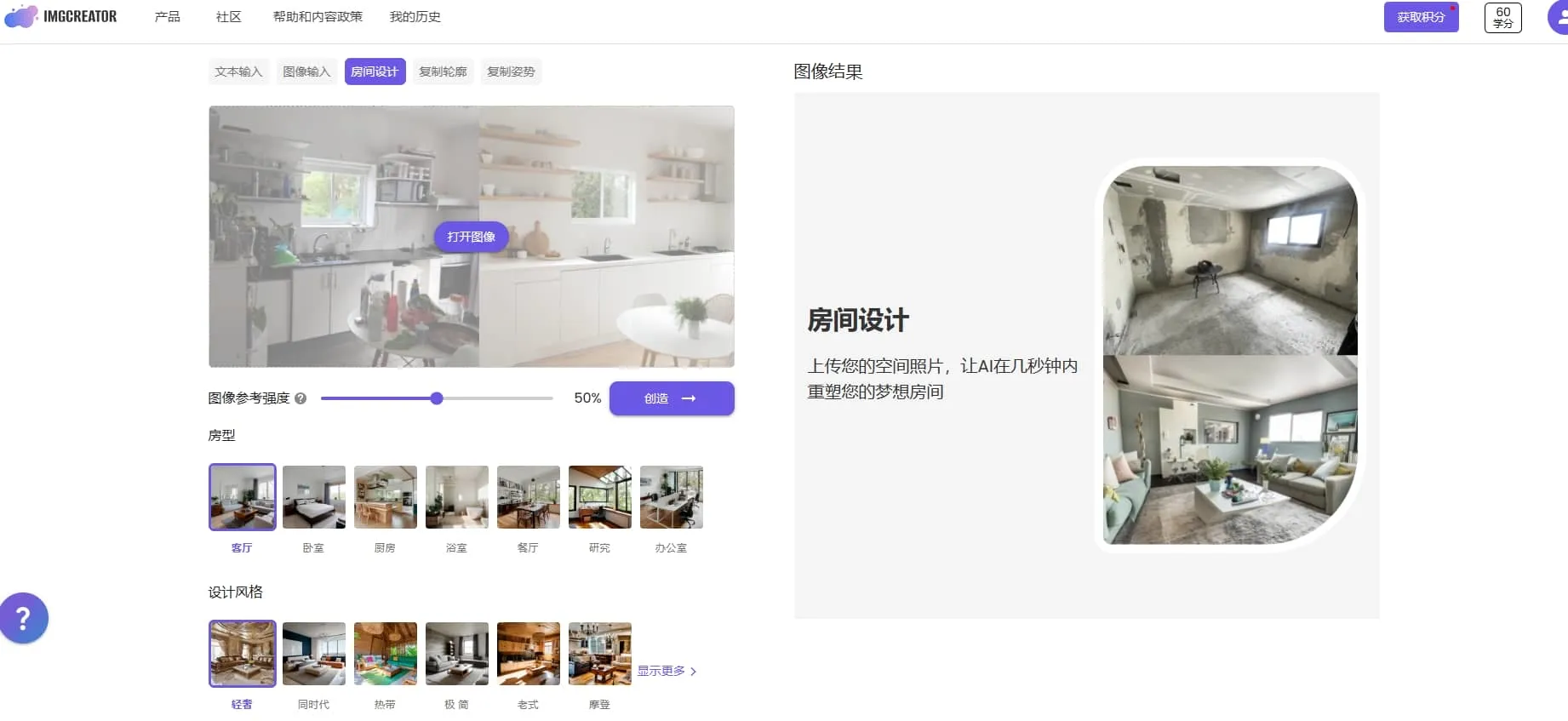 ④如果你想进行房间室内设计,则切换到房间设计,上传你的房间图片,再选择房型、设计风格、图片分辨率、生成数量,然后点击创建就行了!